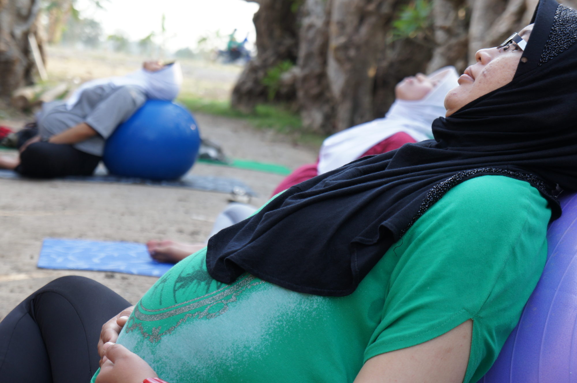 Sepuluh ibu hamil duduk bersila membantuk lingkaran, sambil memegang perut mereka memejamkan mata dan menundukkan kepala sambil menarik nafas panjang dan dalam lalu menghembuskan perlahan beberapa kali.