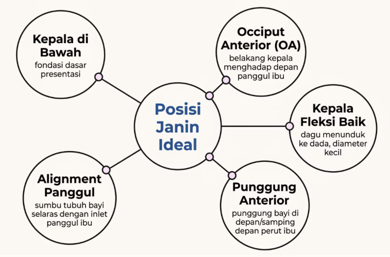 Lima komponen ini saling terhubung dan membentuk satu kesatuan posisi yang dalam istilah obstetri disebut Occiput Anterior (OA). Review Cochrane menyebut OA sebagai “posisi optimal” karena bayi lebih mudah masuk, turun, dan berputar melalui jalan lahir. Sebaliknya, posisi OP (occiput posterior) dan OT (occiput transverse) termasuk malposition yang bisa berkaitan dengan persalinan lebih panjang, lebih nyeri, dan risiko intervensi lebih tinggi.