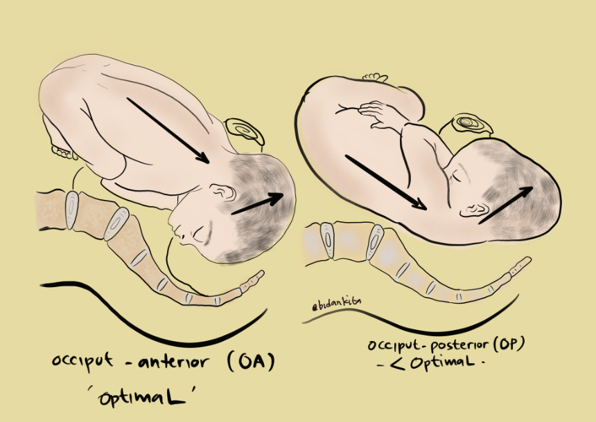 Belakang kepala bayi menghadap depan panggul ibu. Wajah bayi cenderung menghadap ke punggung ibu, punggung bayi terasa dominan di sisi depan perut. Pada posisi OA, sumbu janin lebih mengarah ke sacrum ibu sehingga memudahkan masuk ke pelvic brim yang miring ke depan — inilah yang disebut “easy fit”.