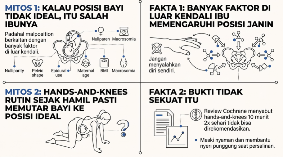 Bayi bukan hanya turun — bayi juga harus berputar. Posisi tangan-kaki, kemiringan tubuh ibu, dan ruang panggul dapat membantu atau menghambat proses rotasi ini. Posisi aktif ibu seperti hands-and-knees, lunge, dan standing terbukti membantu memberikan ruang bagi bayi untuk berputar ke posisi yang lebih optimal.